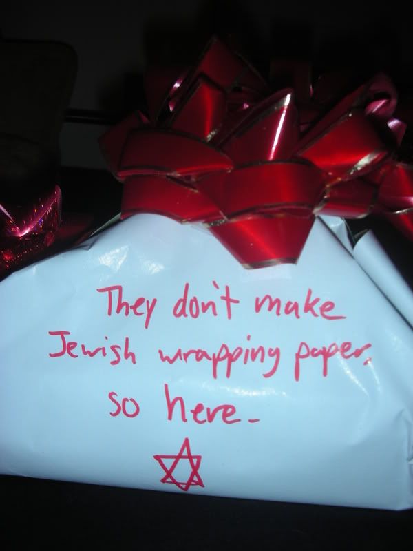 there is such a low demand for jewish wrapping paper, because they don't wrap their presents because unlike christians, they don't like to be surprised, that stores don't carry it. i had to turn mine inside out (sarcasm [in case my mom is reading this]).